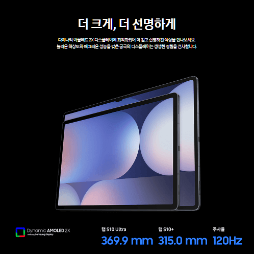 갤럭시탭 S10 울트라는 14.6인치의 대화면을 자랑하며, 120Hz 주사율의 AMOLED 디스플레이를 탑재하고 있습니다.