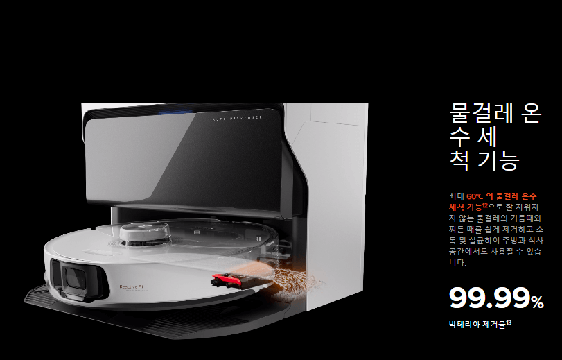 자동 세제 디스펜서 기능으로 청소할 때 매번 세제를 넣을 필요도 없고 얼마나 넣을지 계산하지 않아도 됩니다. 세제 통은 한번 채우면 3개월 이상도 사용 가능한 용량이에요. 사용한 물걸레는 뜨거운 물로 세척을 하고 뜨거운 공기로 가열 건조가 가능하기 때문에 위생적이기도 하며, 사람이 신경 쓸만한 부분이 정말 적어졌다고 볼 수 있습니다.