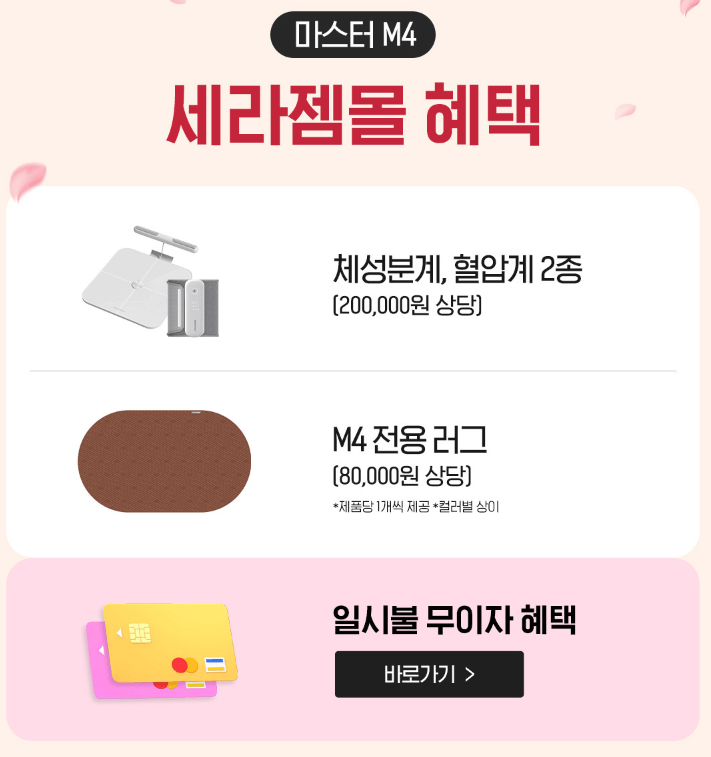 ㅇ 세라젬 파우제 m4를 구매하시면, 체성분계, 혈압계 2종과 M4 전용 러그를 제공받습니다. 또한, 무이자 할부와 무료 배송, 무료 설치 서비스도 제공됩니다.