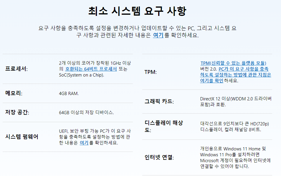 ✅ 윈도우11을 설치하기 위해서는 최소 사양을 충족해야 합니다.